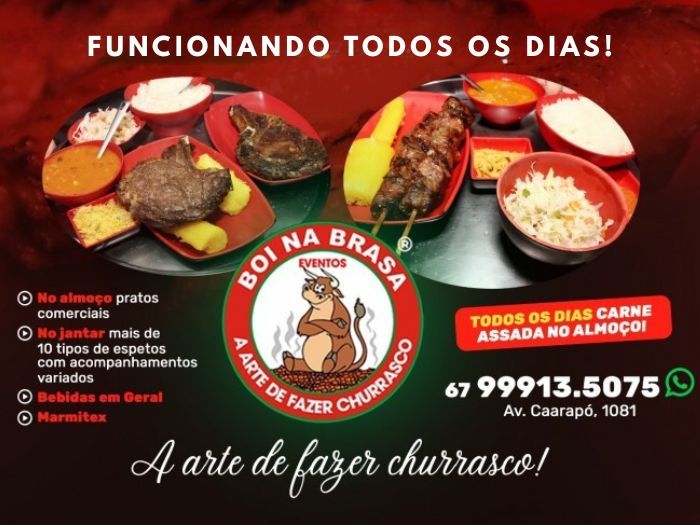 Boi na Brasa, a arte de fazer churrasco! Funcionando de quinta a terça-feira, no almoço pratos comerciais, no jantar mais de 10 tipos de espetos com acompanhamentos variados, bebidas em geral e marmitex. Todos os dias carne assada no almoço!